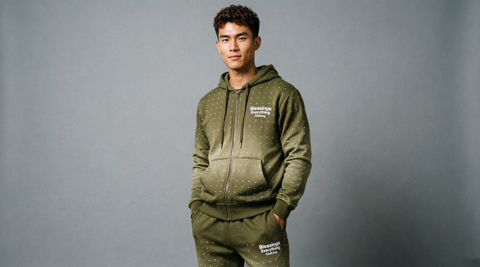 Elevate your streetwear game with this premium olive green gradient tracksuit from Blessings Everything Clothing. This eye-catching two-piece set features a full zip hoodie with ombre color transition and matching tapered joggers, both adorned with scattered white embellished dots for a unique, head-turning aesthetic. Crafted from soft, breathable fabric blend that ensures all-day comfort whether you’re lounging, hitting the gym, or making a style statement on the streets. The contemporary fit, functional pockets, and signature branding make this tracksuit the perfect fusion of comfort and urban fashion.