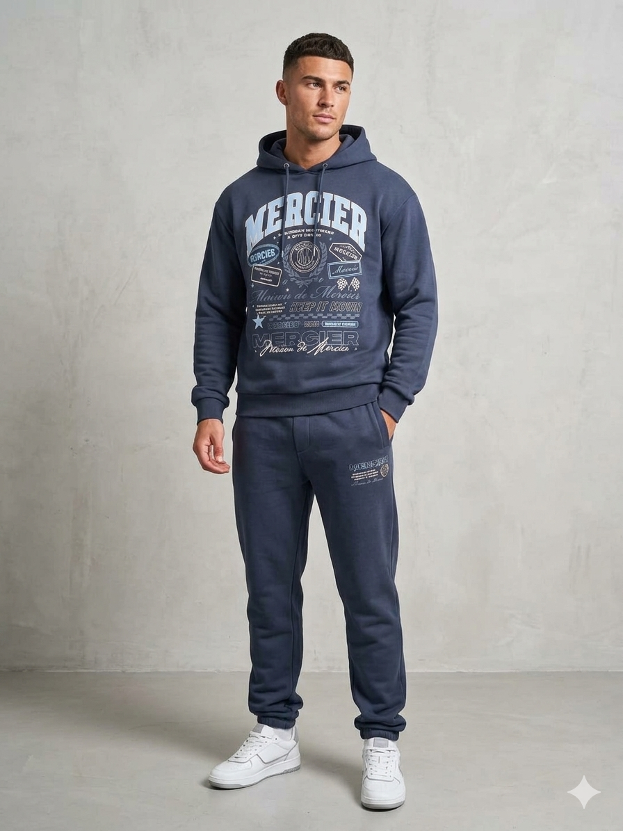 Redefine your urban style with the Maison De Mercier Signature Graphic Tracksuit. This premium set, crafted from soft, dark navy cotton fleece, features iconic light blue ‘MERCIER’ text and elaborate “Suburban Nightmare / A City Dream” typography and crest work. Designed for a tailored yet comfortable fit, the matching trousers complete the look with subtle, embroidered leg detailing. Perfect for those who crave bold, sophisticated streetwear that makes a statement.